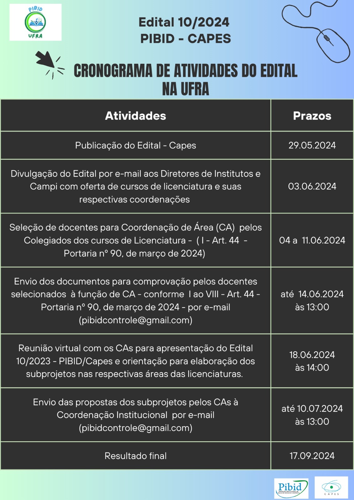 Informamos que o prazo para envio dos documentos dos Coordenadores de Área selecionados - Edital PIBID/2024, conforme Portaria 90 - CAPES, I a VIII, art. 44, de março/2024, foi prorrogado até dia 21/06/2024.
